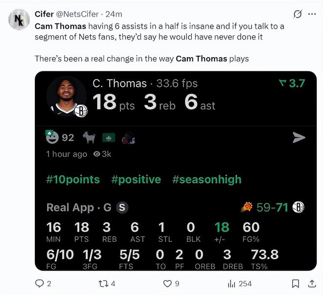托马斯首节6中6,三分1中1,罚球1中1拿到14分1篮板1助攻1抢断,NBA官方都发推为他打Call,首节他帮助篮网打出39-29的高潮。